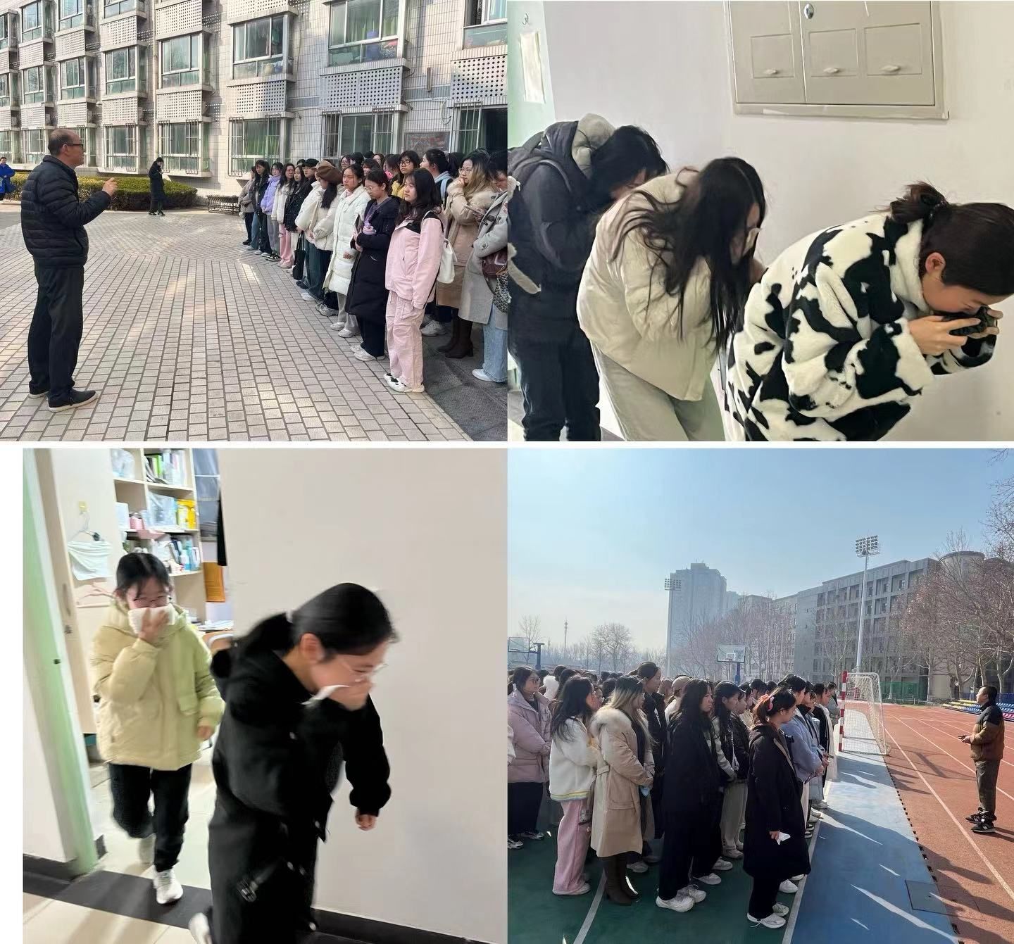 当演练警报声响起时,疏散正式开始,现场组织人员各司其职,迅速到达指定岗位。同学们用湿毛巾捂住口鼻,沿指定路线低头弯腰快速下楼,有序撤离到学校操场,随后班长清点各班人数,并报告给负责教师,确保每一名同学安全逃生。最后保卫处老师对此次消防演练活动进行了点评和指导,并表示希望广大师生时刻提高自我安全防范意识,增强自救能力,严防伤害事故的发生。