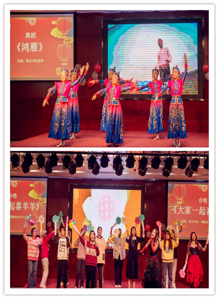 平日里严谨治学的老师们转眼间化身为一群曼妙轻柔的舞者,她们带来的舞蹈《鸿雁》深情诗意又富有力量,赢得师生阵阵喝彩,把整场演出推向高潮。一曲《大家一起喜羊羊》合唱为联欢会画上了圆满的句号,体现了数信学院这个大家庭的友好团结和欢乐祥和。