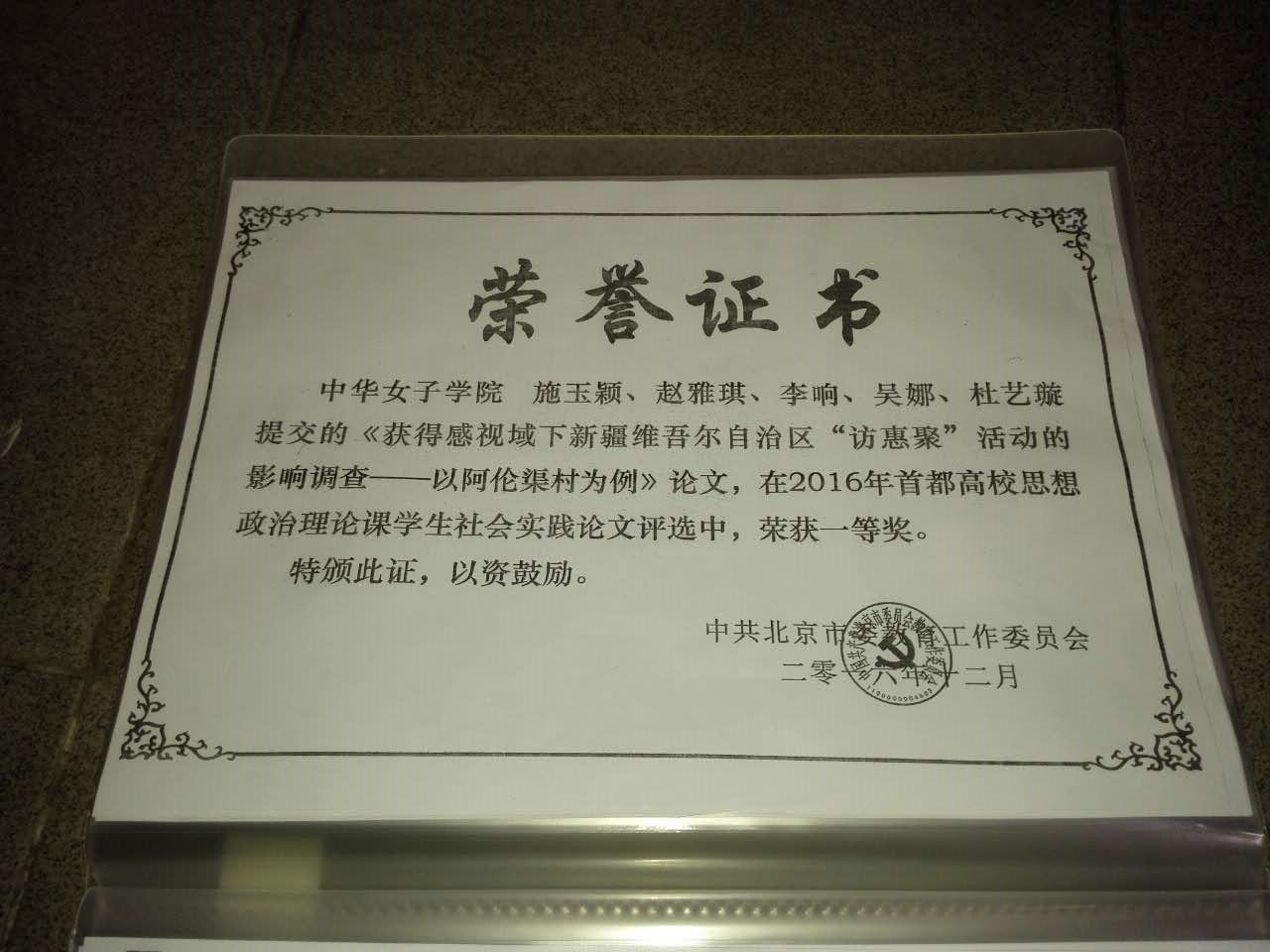 必赢官网学生在2016年首都高校思想政治理论课学生社会实践论文评选中,荣获一等奖