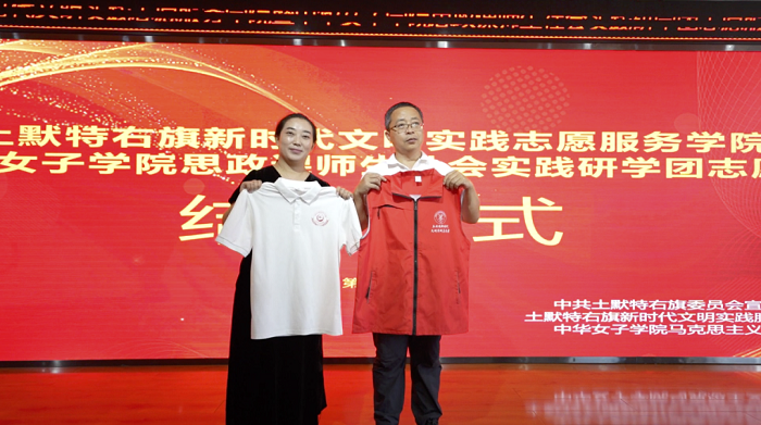 在接下来的活动仪式中,bwin必赢中国官网马克思主义学院副院长苗伟东与土右旗新时代文明实践服务中心副主任赵丹互赠志愿者马甲,并由双方成员们共同签名留念。