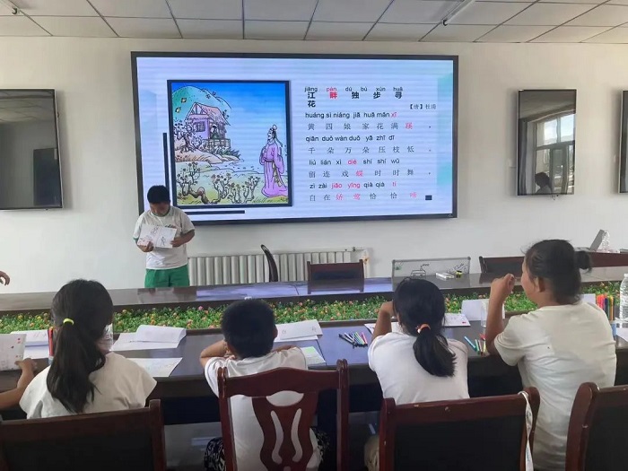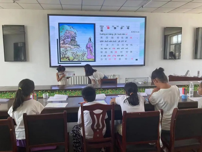 同学们还给孩子们带来了“诗之本味”的古诗鉴赏课程。古诗鉴赏新颖的课堂教学模式也调动了小朋友们学习热情,积极思考、热情互动,或读或写,或讲或画,在沉浸式的体验中,小朋友们切实体味和感受到了中国古诗词文字之美,意境之美,是一次有趣的文化之旅。