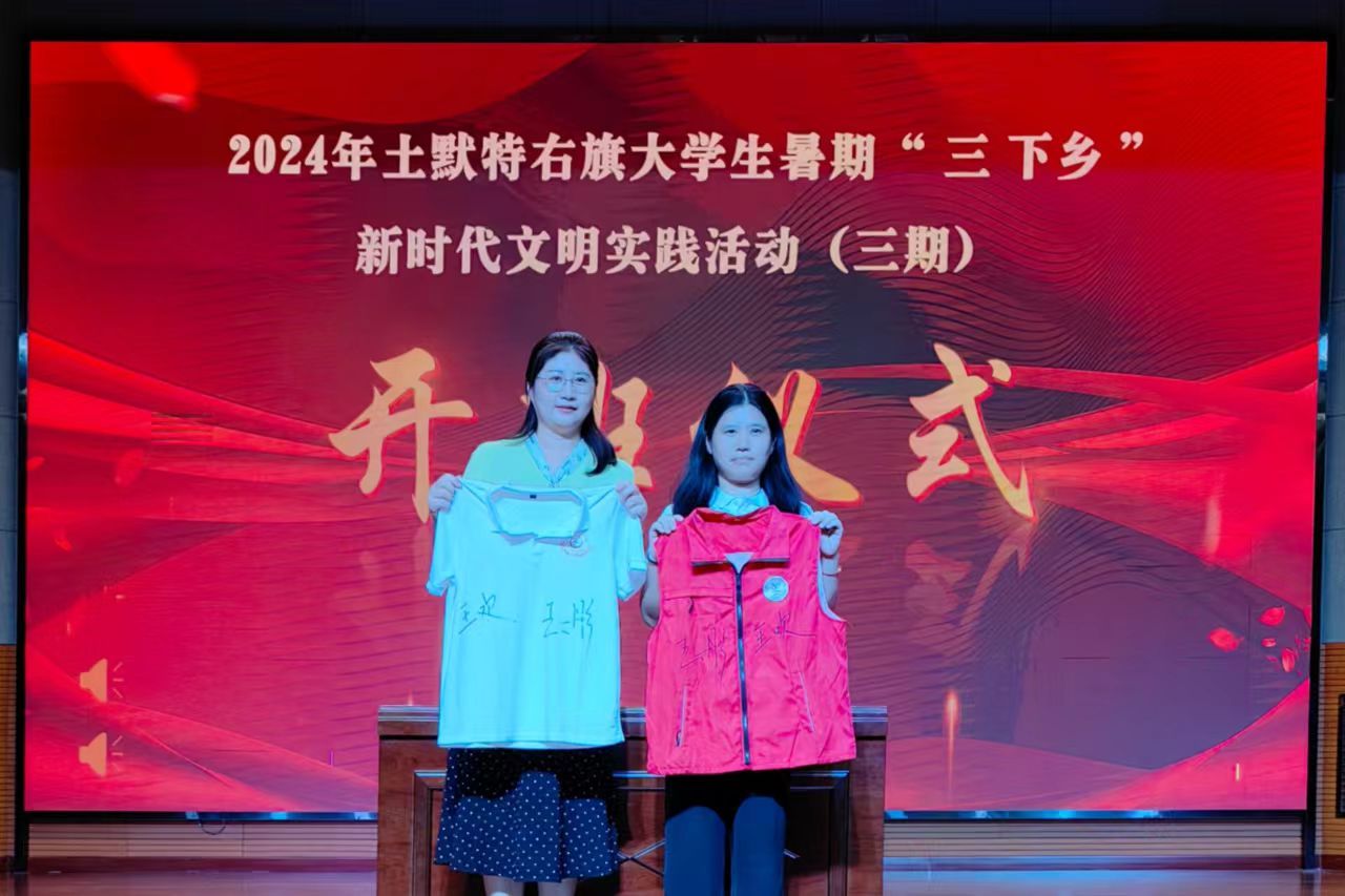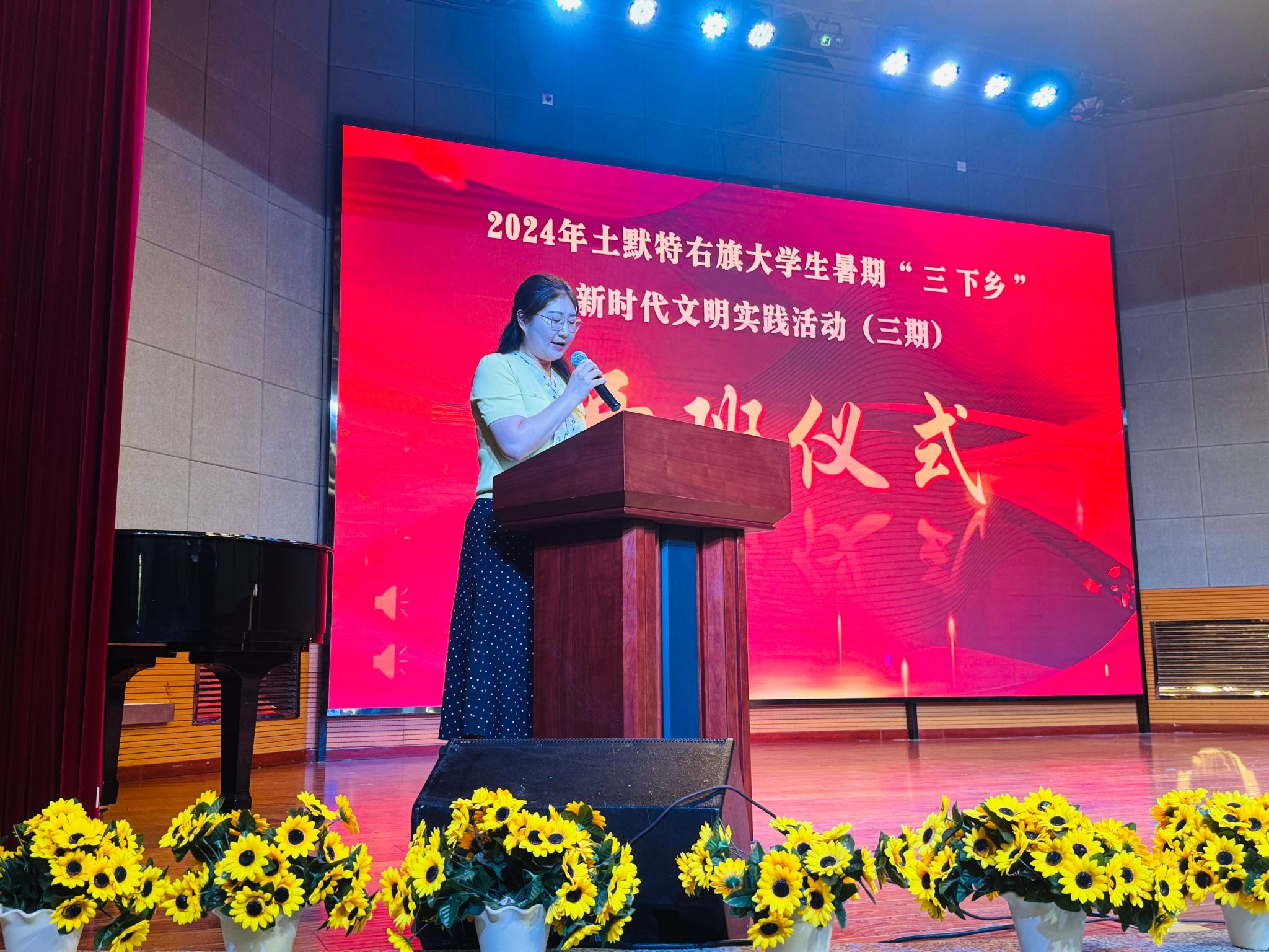 当天下午,实践团抵达土右旗教育局,与土默特右旗新时代文明实践志愿服务学院携手,举行了开班仪式。开班仪式由土默特右旗新时代文明实践服务中心主任耿慧玉主持。土默特右旗党委常委、宣传部部长王彤致辞,她对全体师生来到土默特右旗进行社会实践表达了热烈的欢迎,并寄望于同学们能够在此次活动中切实获得宝贵的经验和深刻的启示,将所学所悟用于服务人民、贡献社会。她希望同学们牢记“举旗帜、聚民心、育新人、兴文化、展形象”的使命任务,将其贯穿于新时代文明实践的各个环节之中,共同推动社会文明的进步与发展。