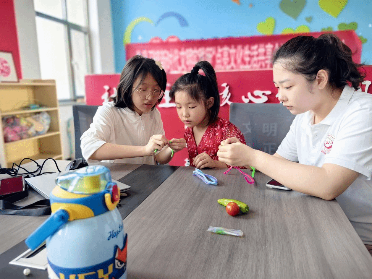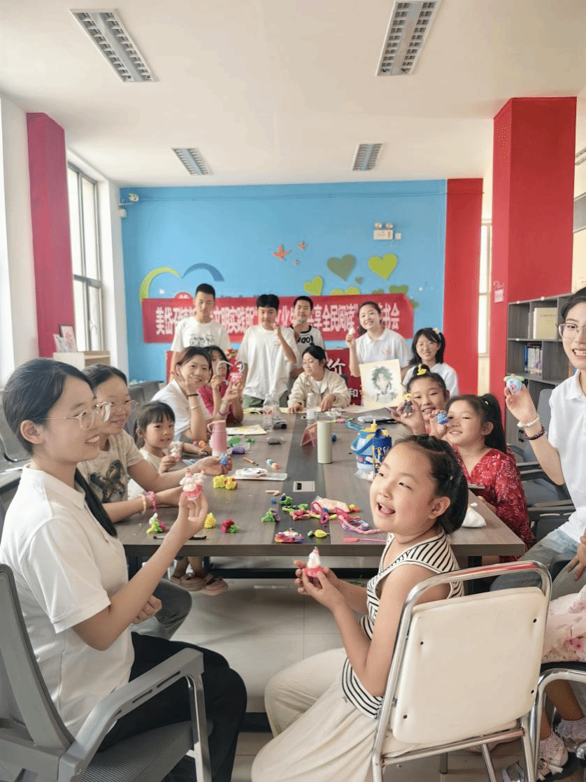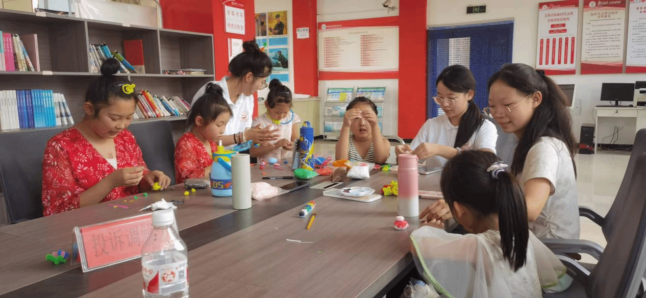 在室内,同学们带领孩子们在色彩的世界里尽情发挥创造力,孩子们不仅亲手创作出形态各异的粘土作品,还以画笔为媒介,将心中所想、所感倾泻于画布之上,展现出自己丰富的想象力。