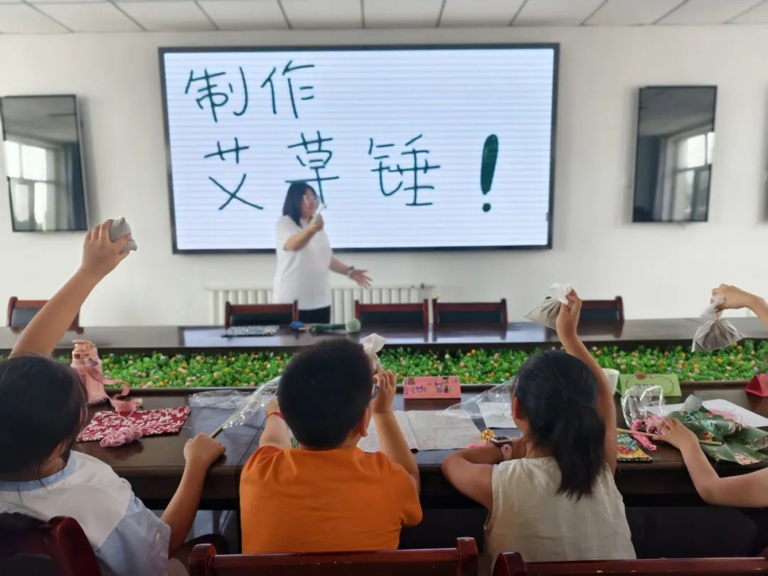 艾草锤手工课上,同学们不仅介绍了艾草的知识,还讲解了传统寓意,详细示范艾草锤制手法与捆绑技巧。孩子们在同学们的指导下从生疏到熟练,终于做出成型的艾草锤,在创作中领悟了传统礼敬之仪。