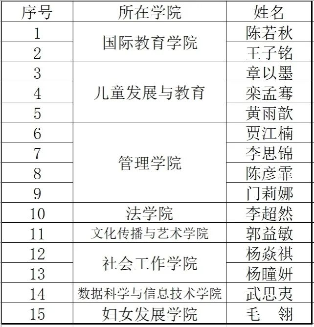 报名参加马克思主义学院2024年暑期社会实践团有近50支团队的300余名同学。经过两场精彩的展示和激烈的竞争,评委组老师遵循公开、公平、公正的原则,结合本年度暑期社会实践的实际要求、内容和目标,根据各团队成员的展示和表现,经过综合考评,最终有来自国际教育学院等8个学院的15名同学入围本年度马克思主义学院暑期社会实践团,详细名单见下表。