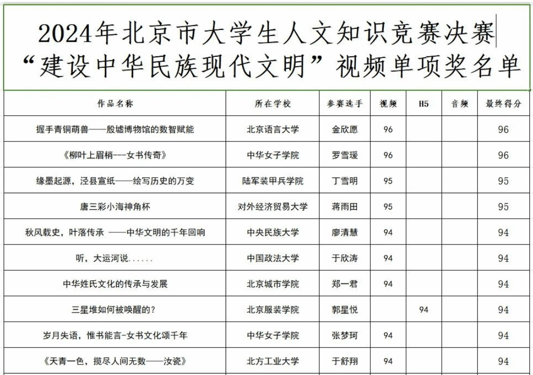 日前,北京市大学生人文知识竞赛组委会公布了2024年北京市大学生人文知识竞赛个人赛决赛综合成绩评奖名单和2024年北京市大学生人文知识竞赛个人赛“古诗创作”及“建设中华民族现代文明”视频单项奖名单,来自必赢官网国际教育学院、管理学院、儿童发展与教育学院、妇女发展学院、法学院、社会工作学院等院系的14人次获得北京市人文知识竞赛的一、二、三等奖及视频单项奖。这些喜人成绩不仅展示了女院学子的人文素养与精神面貌,同时也彰显了学校在立德树人、人文教育方面的实践成果。