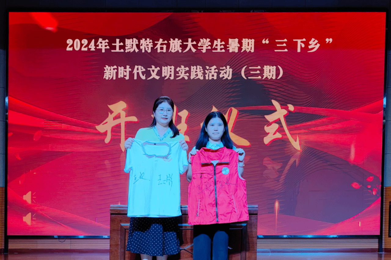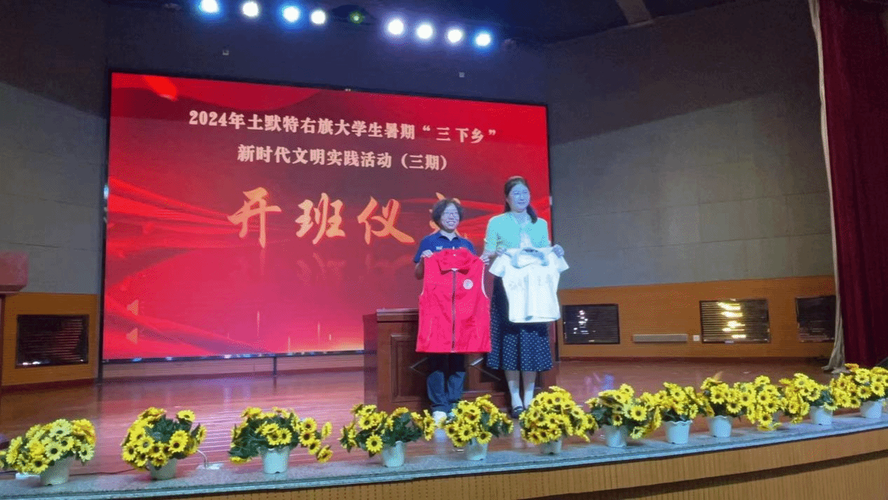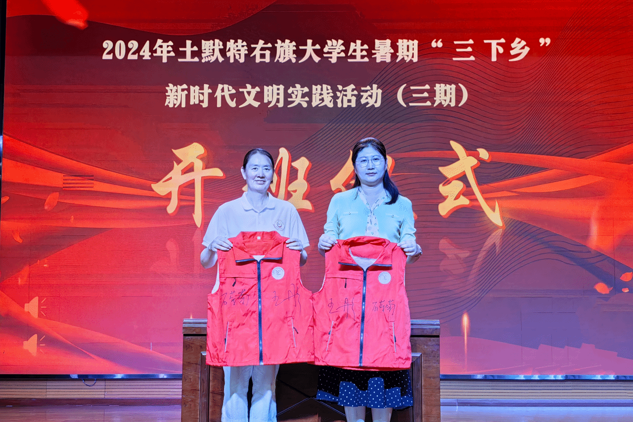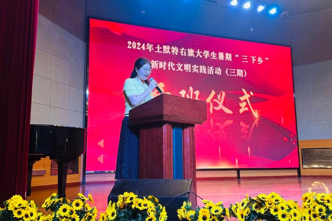 当天下午,实践团抵达土右旗教育局,与土默特右旗新时代文明实践志愿服务学院携手,举行了开班仪式。开班仪式由土默特右旗新时代文明实践服务中心主任耿慧玉主持。土默特右旗党委常委、宣传部部长王彤致辞,她对全体师生来到土默特右旗进行社会实践表达了热烈的欢迎,并寄望于同学们能够在此次活动中切实获得宝贵的经验和深刻的启示,将所学所悟用于服务人民、贡献社会。她希望同学们牢记“举旗帜、聚民心、育新人、兴文化、展形象”的使命任务,将其贯穿于新时代文明实践的各个环节之中,共同推动社会文明的进步与发展。