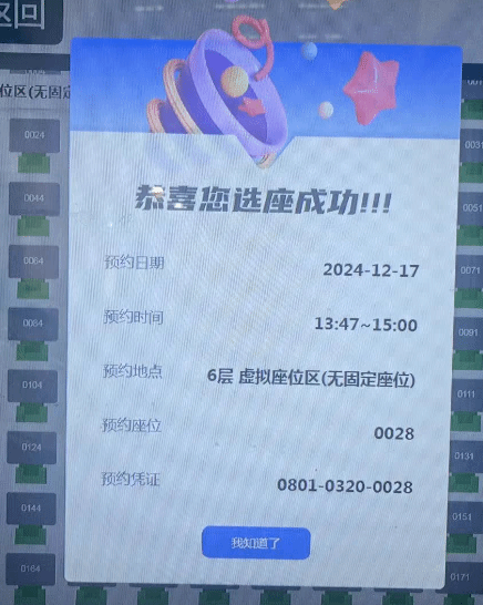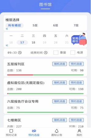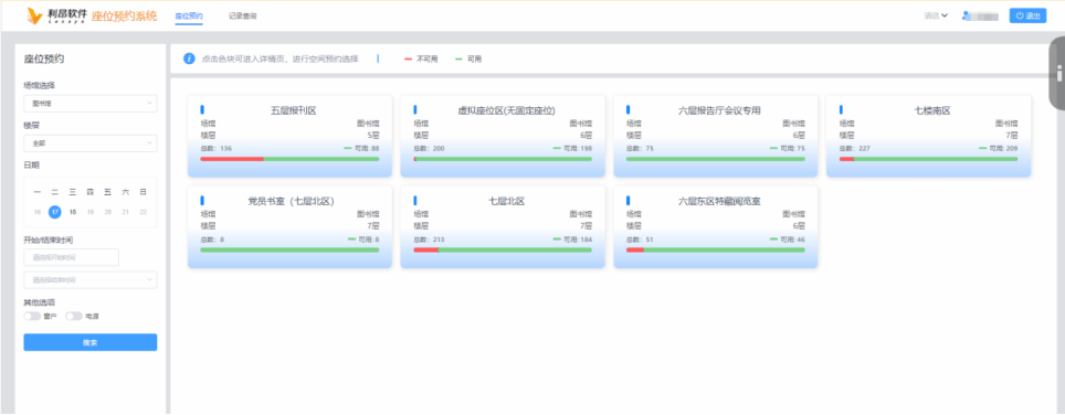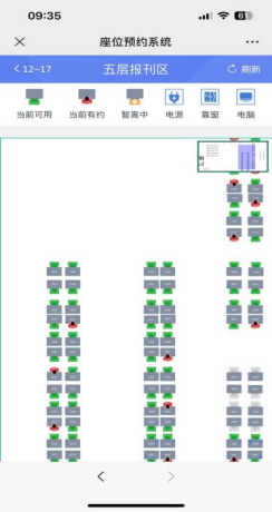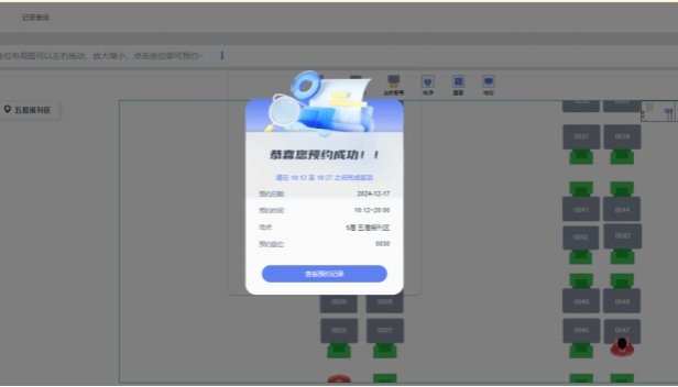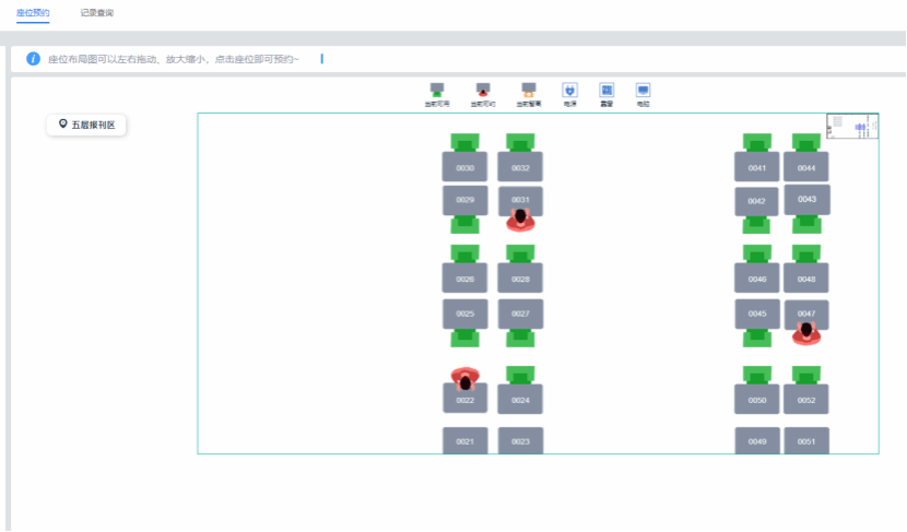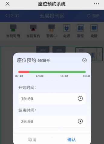 8.在弹出的座位图中,绿色是可以预约的座位,红色是已被预约的座位,读者选择绿色座位进行预约。选择座位,并选择时间。