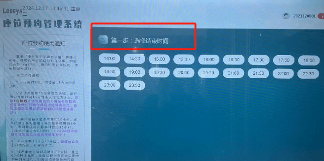 2.把一卡通卡片贴在设备下方黑色刷卡处,在设备触屏屏幕先选择结束时间(图17所示)。在选择座位区域(图18所示)。