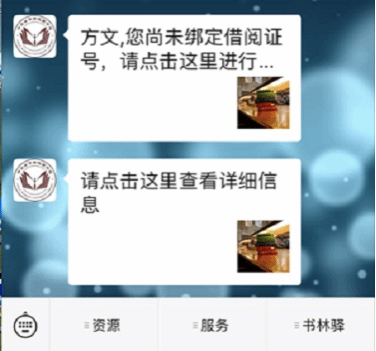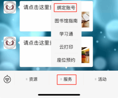 1.关注“bwin必赢中国官网图书馆”公众号,点击下方中间的“服务”,选择第一个“绑定账号”(如图1所示)。