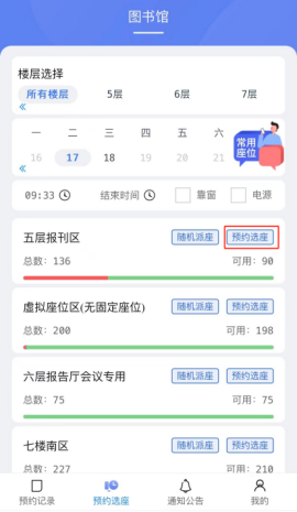 6.进入座位预约界面后,点击下方中间的“预约选座”(图6所示)。