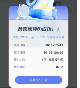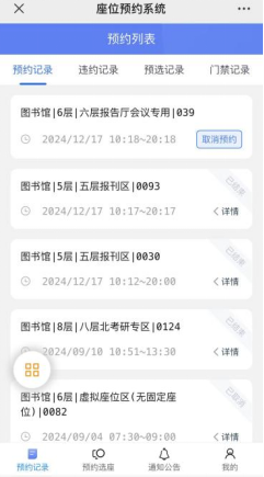 10.在“座位系统”页面,下方左边的“预约记录”页面,即可看到刚才预约成功的座位的预约记录(图10所示)。