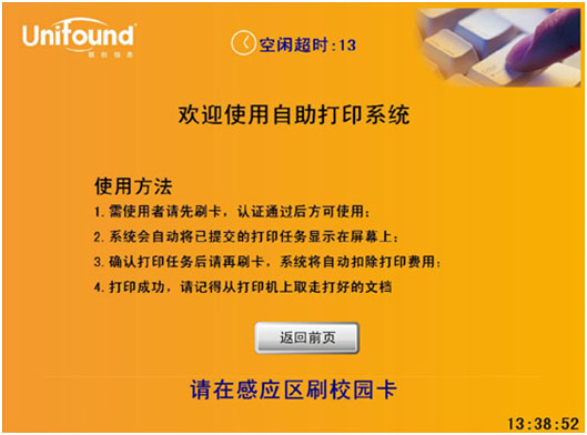 8. 刷卡打印 触摸点击自助打印功能选项后,将弹出提示刷卡界面。请使用校园卡,在刷卡区域进行刷卡确定,打印出该文档。