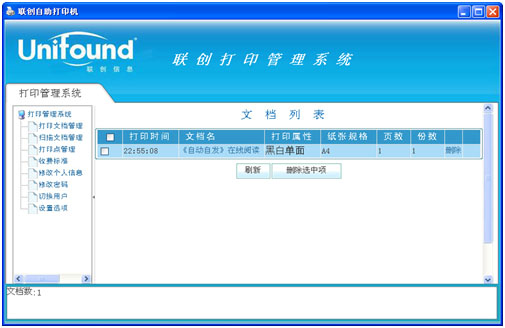 4. 查看列表 如果需要查看已经提交的文档,可在"打印任务提交成功"窗口中,选择"查看打印列表",或者双击运行桌面上的"联创打印管理系统",凭借用户名和密码进入个人文档管理界面, 如下: