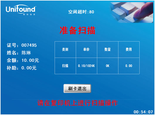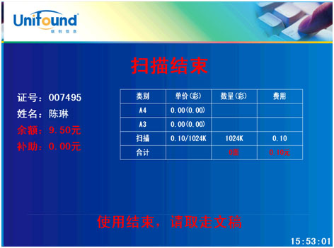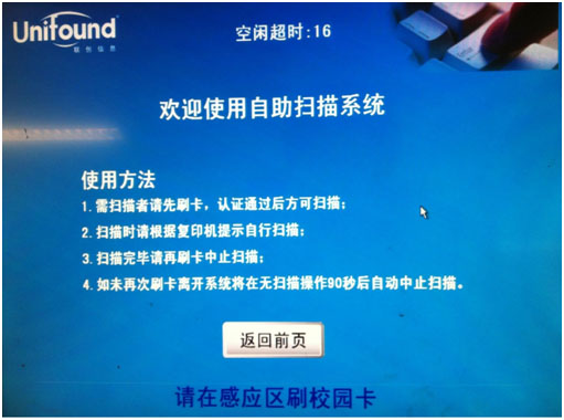 4.结束扫描 确定完成全部的扫描任务后,请使用校园卡在刷卡端的刷卡区域上进行再次刷卡。 此次刷卡将终止本次扫描任务,并对本次的扫描任务进行金额结算。(如果忘记刷卡结束,设备闲置超过90秒后,系统本身会终止本次扫描,但本次扫描的文档,将不能发送到您的个人空间内,扫描未成功)。