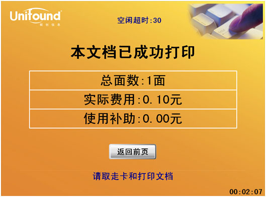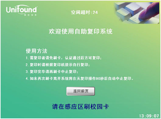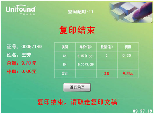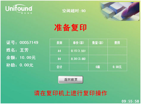 此次刷卡将终止本次复印任务,并对本次的复印任务进行金额结算。(如果忘记刷卡结束,当设备闲置超过90秒后,系统本身会终止本次复印,并对本次复印进行金额结算)。