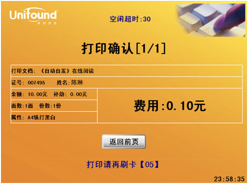 9. 筛选文档 如有多个文档需要打印,刷卡后,将提示您按提交文档的先后顺序,逐一打印。即:选定目标,再次刷卡确定。如暂不打印,等待十秒钟后系统会自动转到下一个待打印的文档上。(请注意,当系统转入下一文档时,您未打印的文档费用将不被扣除。即:文印设备,只扣除实际打印出来的文档费用。)