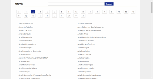 2、期刊导航页,根据首字母排序,可以进行期刊名检索。点击选择期刊可以打开该期刊的期卷列表。