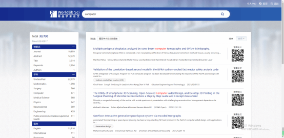 3、首页检索直接进入检索列表页(如图),可以按照检索点、学科、语种、年限等聚合项实现二次检索。可以按照时间、相关性进行排序。可以用手机扫描右侧的二维码进行移动阅读。