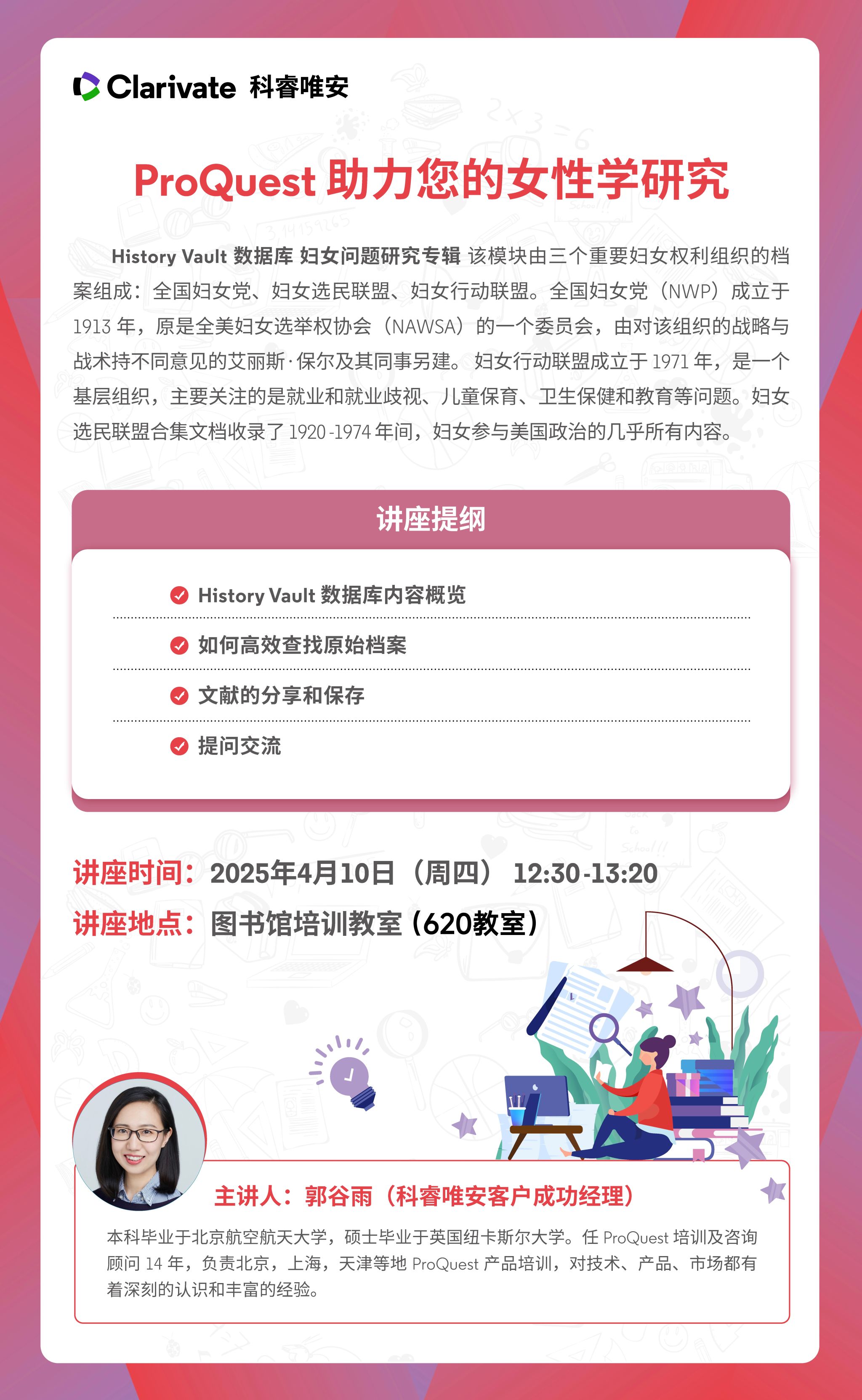 你是否还在为论文的文献稀缺性发愁?想触碰全球女性运动最鲜活的原始档案吗?为帮助大家打破资料获取与运用的瓶颈,本次图书馆“一小时讲座”特邀ProQuest History Vault 数据库妇女问题研究专辑培训师来校开展专题培训。此数据库主要为事实类资料库,记录了美国妇女在政治、生活、教育等领域内的典藏文档,希望为大家在女性学研究的道路上提供助力。
