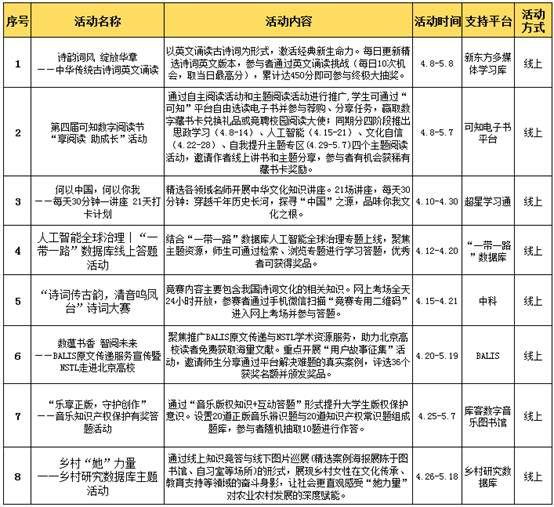 6. 除以上活动外,图书馆还与各数据库平台联合推广系列活动,具体如下:
