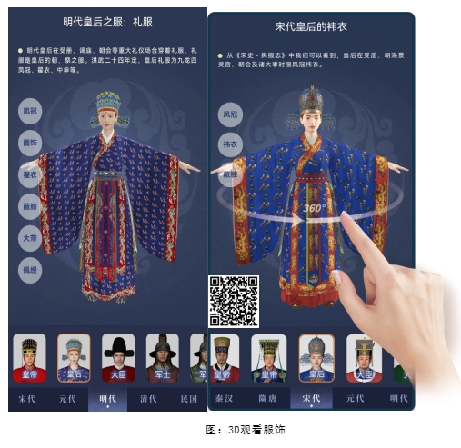 展览是去年三八节的“志于道 美于行”活动的延续。为普及中华传统服饰知识,弘扬中华传统艺术,我馆特别推出一个集教育性、文化性、互动性于一体女性服饰展。它以图文并茂的形式,结合引领前沿科技的3D技术,多方位、多角度、生动形象地展示了灿烂的华夏女性服饰文化。3D服饰模型真实还原了古代服饰的原貌,扫描二维码即可以观看。