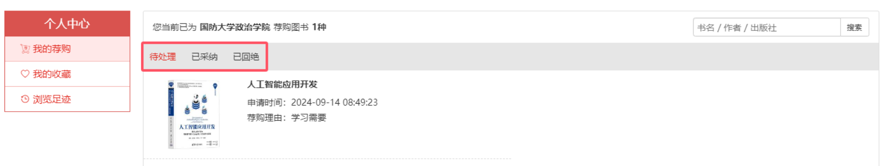 3、我的荐购:【个人中心】→【我的荐购】 中可查看到所有的荐购书目,及图书馆的采纳情况。