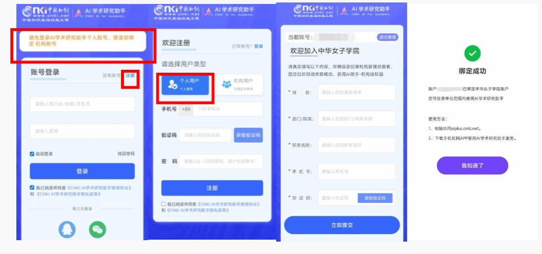 微信扫描上方二维码,点击“注册”,用户类型选择“个人用户”,注册后填写个人信息与学校关联信息(职务名称学生可填“学生”),账户绑定成功之后即可使用学术研究助手手机版。