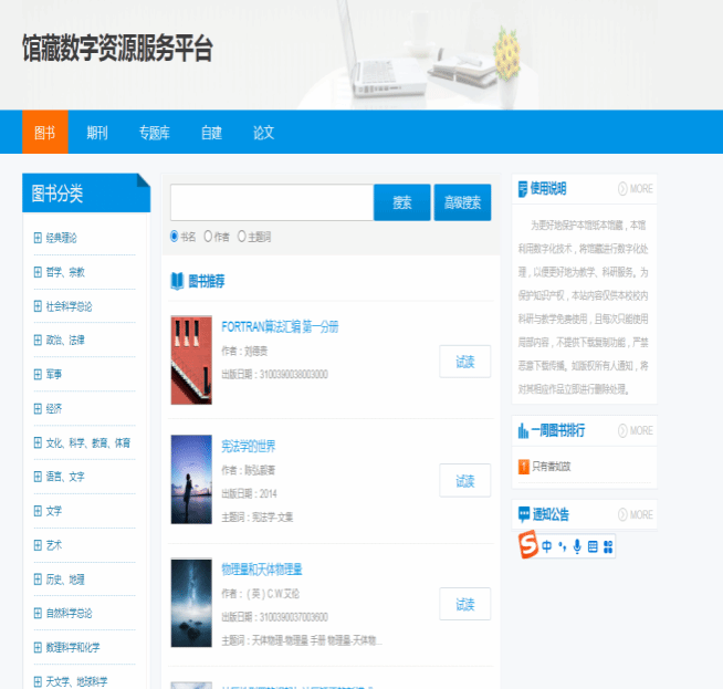 内容简介:以本馆纸本图书馆藏为基础,将其中部分纸本图书数字化后的电子图书安装在此平台上。读者可通过该平台,阅读与纸本图书匹对的电子图书。