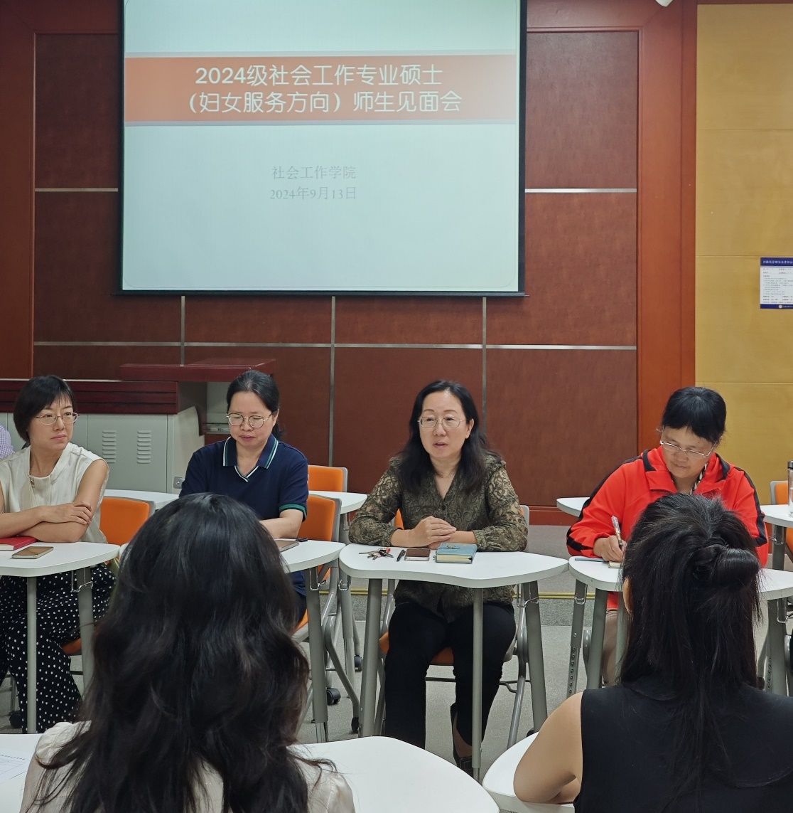 2024年9月13日下午,社会工作学院2024级社会工作专业硕士研究生师生见面会在主楼137教室召开。会议由副院长郝彩虹主持,院长李敏、党总支书记巫晓莲、副院长李芳英、妇女服务方向硕士生导师和2024级社会工作专业硕士研究生新生参加了会议。