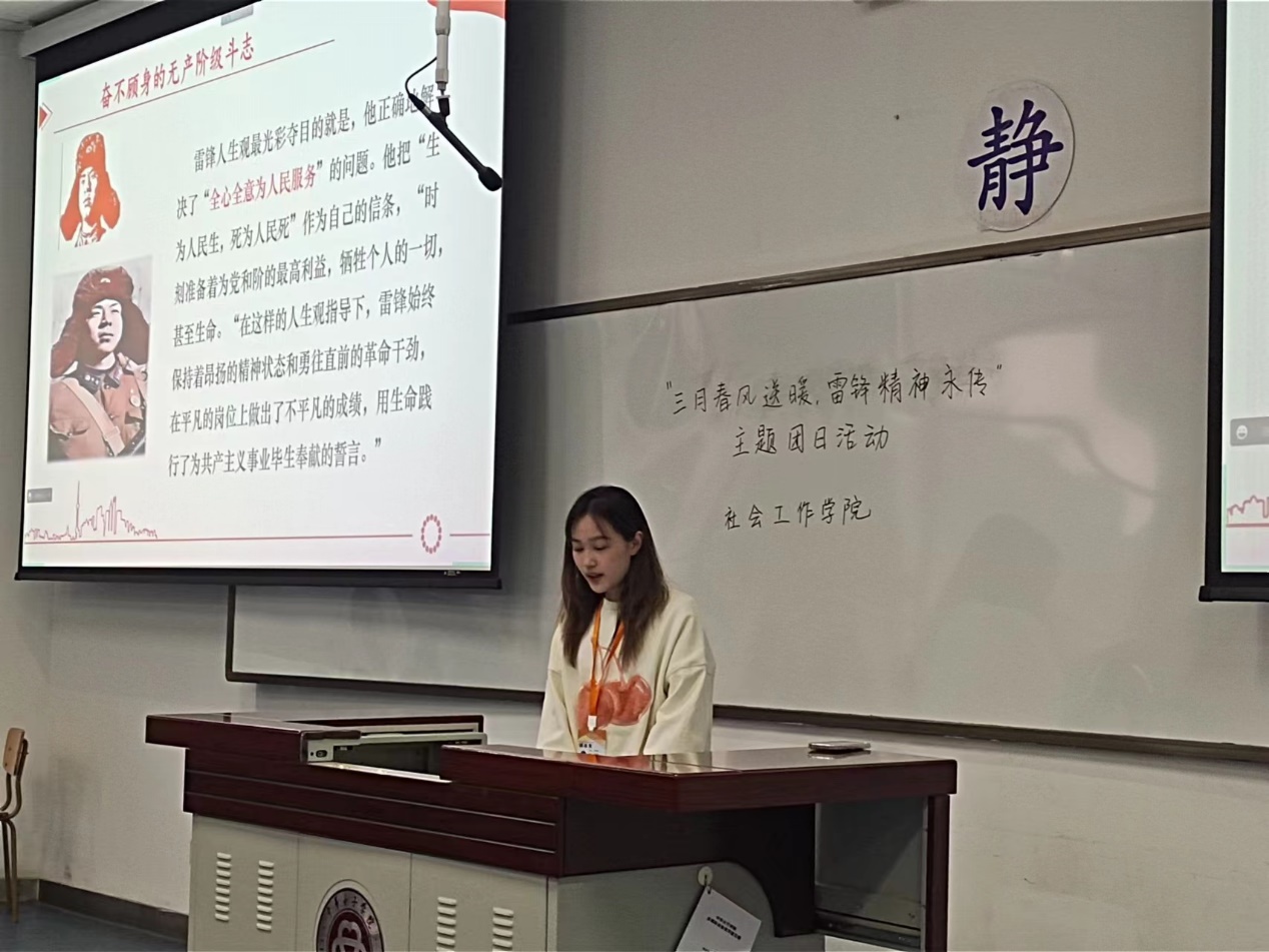 为纪念雷锋,弘扬雷锋精神,社会工作学院于3月16日晚在教图楼312举办“三月春风送暖,雷锋精神永传”主题团日活动。社会工作学院党总支副书记寇琳老师应邀参加,学院团总支和学生会全体团学干部及干事踊跃参加了“三月春风送暖,雷锋精神永传”学雷锋主题团日活动。此次主题活动由学院援边社与“橙房子”志愿服务队两个社团携手承办。