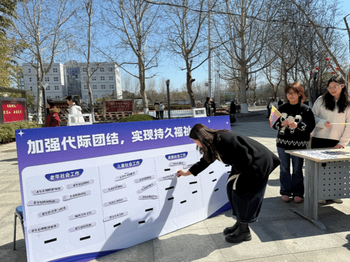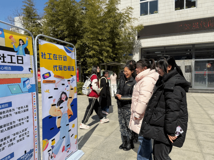 2025年3月18日(星期二)是第19个国际社工日。为增强学校师生对社会工作专业相关知识的了解,提高对社会工作者的关注,使更多的师生知晓社会工作在推动社会和谐与化解社会矛盾中的关键地位及起到的重要作用,提升全院师生对社会工作在加强代际团结、实现持久福祉方面重要作用的认知和理解,让更多的人了解到社会工作在其中所扮演的关键角色及发挥的重要功能,2025年3月18日至19日,在学院党政领导的高度重视和社会工作专业教师的支持下,社会工作学院团总支举办了国际社工日系列宣传活动,倡导全院师生同心协力“加强代际团结,实现持久福祉”,共同探索代际互助的深刻内涵,传递社会工作的温暖力量。本次活动通过趣味互动、知识科普、观影创作等形式,吸引了全校师生热情参与。