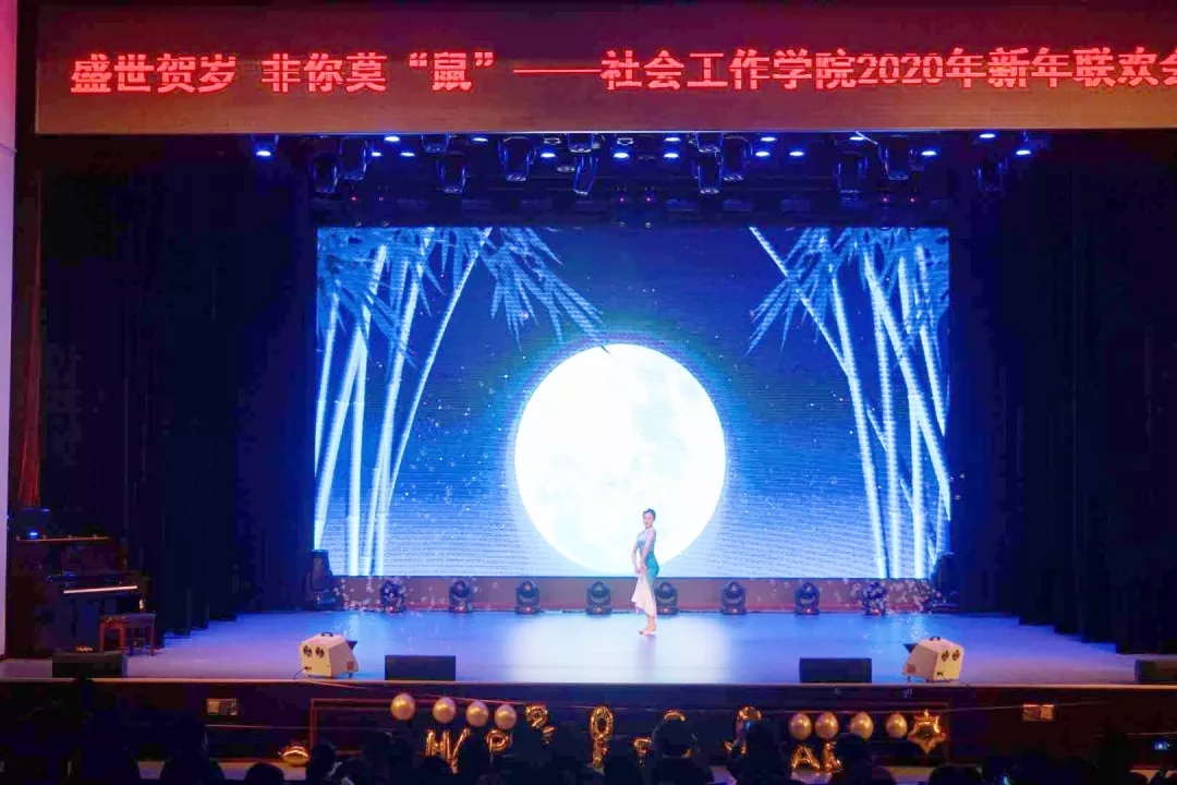 为迎接即将到来的2020年,社工学院于12月20日晚在学校礼堂举办了以“盛世贺岁,非你莫‘鼠’”为主题的新年联欢晚会。参加晚会的领导嘉宾包括社工学院党总支书记齐小玉老师、北校区负责人郭春鸿老师、社工学院院长助理李敏老师、社工学院其他老师们,以及17、18、19级的全体学生。晚会由谷劲松老师与周寅春、米丹丹、杨夏兵、宫珲四位学生共同主持。