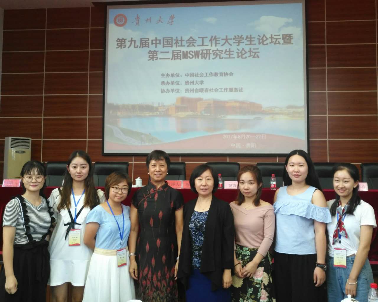 由中国社会工作教育协会、全国社会工作专业学位研究生教育指导委员会联合主办,贵州大学承办的第九届中国社会工作大学生论坛暨第二届MSW研究生论坛于2017年8月21日-22日在贵阳邮电培训中心举行。来自全国高校社会工作专业的140名本科生及63名研究生参加了本次论坛,在我院院长助理兼研究生教研室主任李敏教授的带领下,我院2016级研究生梁瑜欣、李珊,2014级社会工作专业本科生贾正宇、袁双参加了此次论坛。