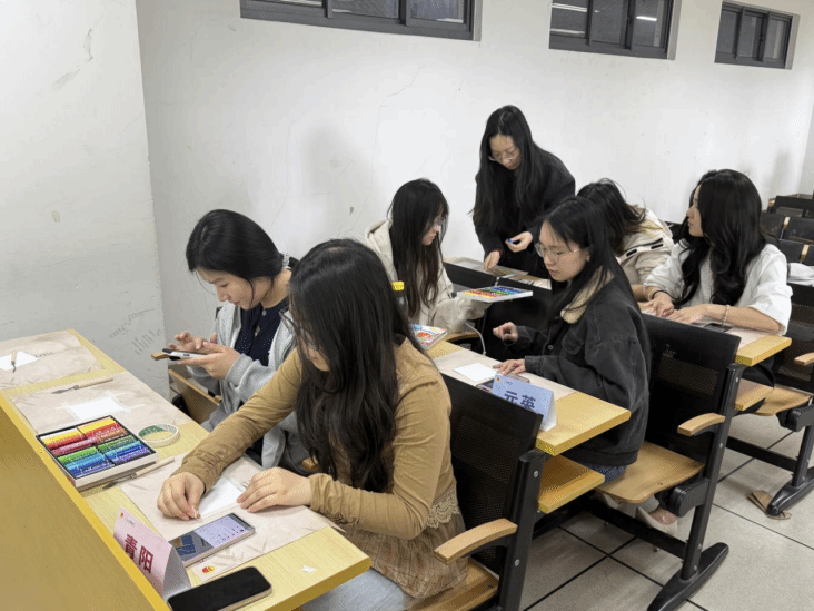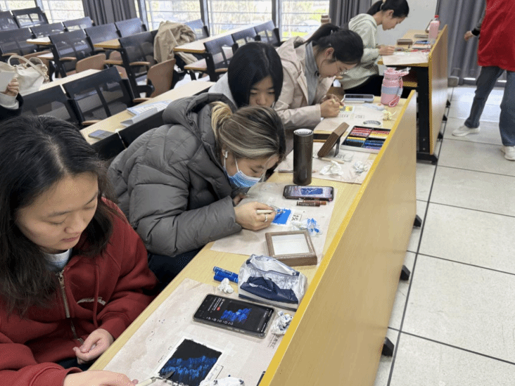 在实践环节,同学们充分发挥想象力,将自然元素与文化符号巧妙融合,大家专注于手中的画笔,通过不同的笔触和色彩表达对节气的独特理解,力求创作出兼具美感与文化内涵的个性化作品,同学们相互交流、互相借鉴,形成了浓厚的创作氛围。