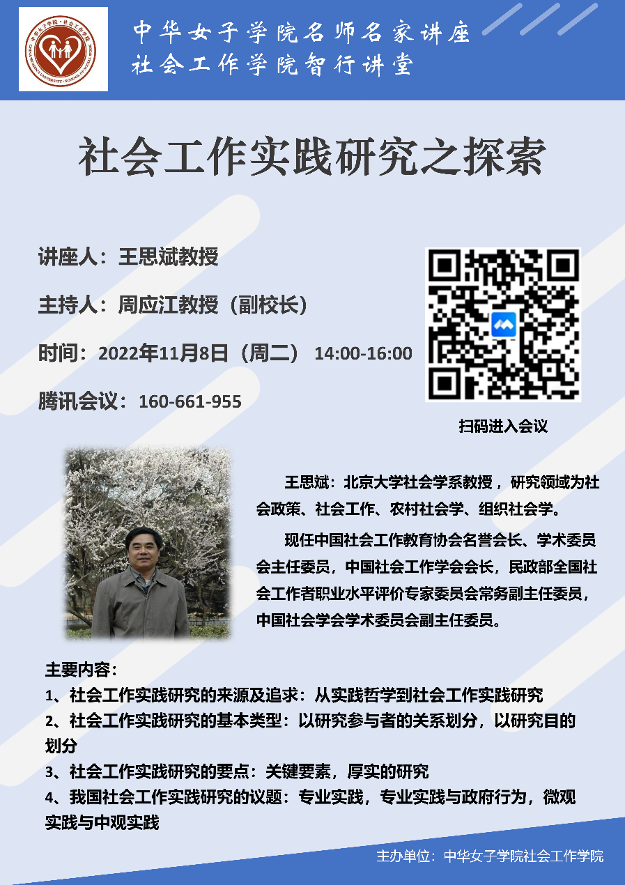 bwin必赢中国官网名师名家学术论坛暨社会工作学院智行讲堂拟于11月8日(周二)下午举办学术讲座。学校邀请到北京大学社会学系王思斌教授为广大师生做题为“社会工作实践研究之探索”的线上主题讲座。