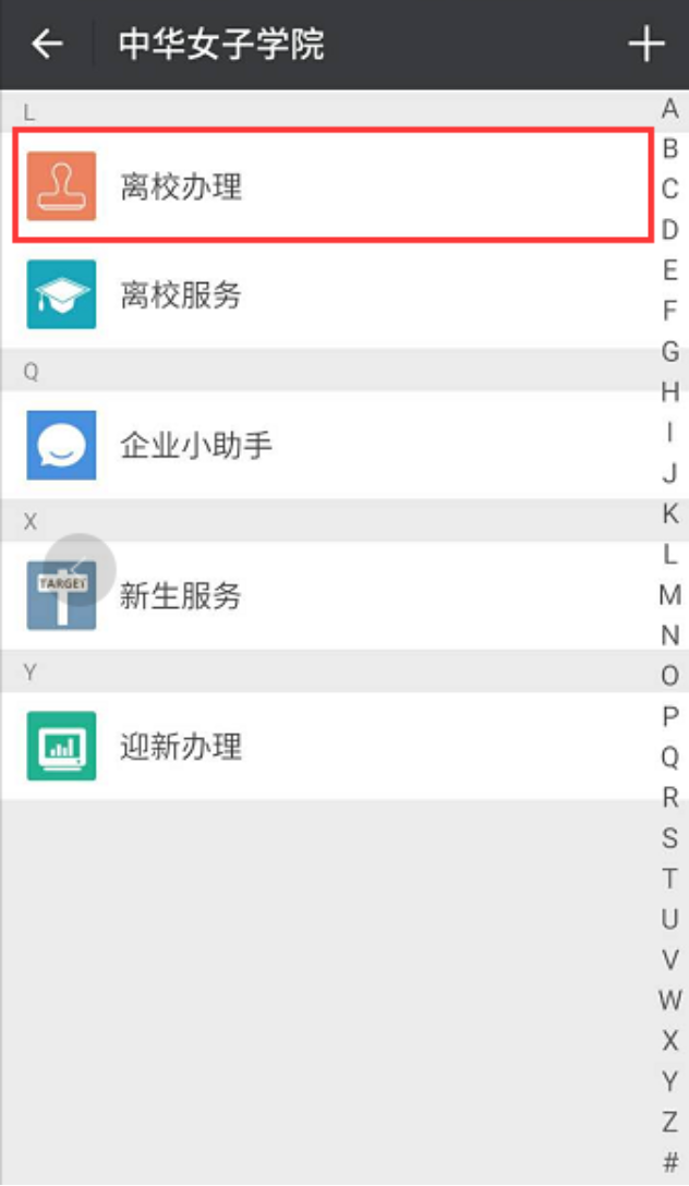 1、进入bwin必赢中国官网企业号,点击“离校办理”功能,选择输入办理。