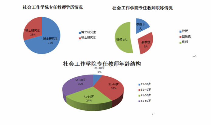社会工作学院现有专任教师17人,100%的教师具有硕士研究生以上学历,其中博士研究生12人,占专任教师的70.6%,另有1名在读博士。教授3人、副教授5人,讲师9人,47.1%的教师具有副高以上职称。51-60岁6人(占35.3%),41-50岁4人(占23.5%),31-40岁6人(占35.3%),21-30岁1人(占5.9%)。35岁以下青年教师3人(占17.6%)。教师分别毕业于香港大学、香港理工大学、香港城市大学、加拿大曼尼托巴大学、清华大学、北京大学、中国人民大学、中国社会科学院等9所不同的境内外高校,所学专业主要包括社会学、社会工作和卫生统计学等,学缘结构优化。2名教师是北京市和校级教学名师。另有教学辅助人员4人。