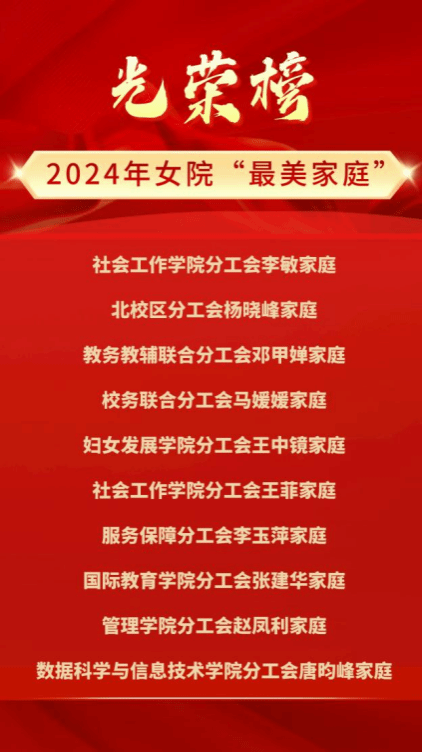 2024年5月15日,必赢官网揭晓了2024年女院十大“最美家庭”,10个家庭全名单如下: