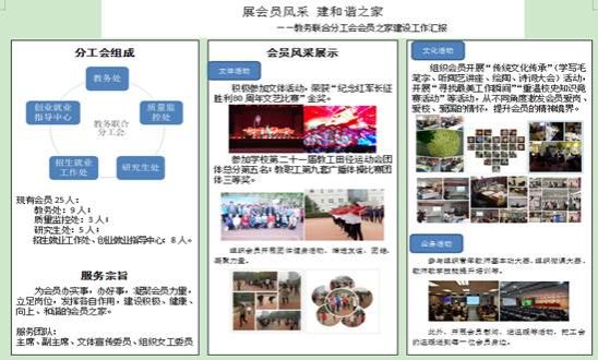 一是分工会各部门立足岗位,做好学校招-培-就环节的各项工作。教务联合分工会各位会员在一起七年,共同参与完成了第一轮本科教学审核评估工作,共同抗击疫情开展线上教学,顺利通过了三个硕士点的申报成为硕士授予单位并开展了相关建设工作,完成了首次研究生考点组考等重大工作,内容涵盖了本硕教育从招生、培养到就业的各项工作。大家在各自岗位上兢兢业业,努力为培养高质量人才做出了应有的贡献。二是部门每学期期初、期末召开工作会,通报部门总结、计划,包括经费预算和执行情况,切实推动部门民主建设。三是参与学校民主政治生活,将会员心声反馈到学校。四是分工会档案材料齐全。