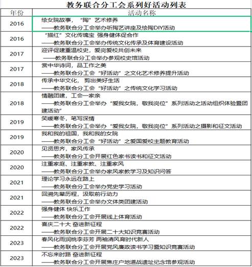 分工会创新工作方法,丰富活动内容,着力打造活动品牌,主要围绕爱党、爱国、爱校、爱岗而设计,2016年至今围绕这些内容开展了丰富多彩的文体、团建活动。