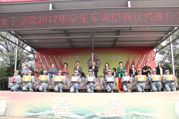 军训团团长王玉华全面总结了2017年军训工作,军训团政委郭春鸿宣读了表彰决定,与会领导为军训中涌现出的先进集体和优秀个人代表颁奖。军训标兵邓钰代表1602名参训学生发言。刘梦向军训基地赠送了锦旗。
