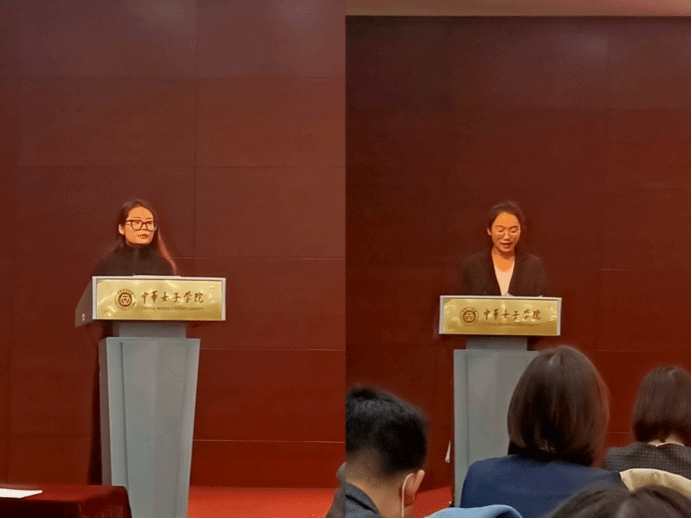 紧接着,18级刘佳琪同学作为育慧书院一期的学生代表发言,她分享了自己两年来在育慧书院的成长与收获,强调了英语思维的重要性,以及自身探寻问题能力、领导力与社会责任感的提升,并对育慧书院新生发出三点倡议:锻炼语言能力,拓宽国际视野;夯实专业基础,聚焦社会热点;展现女性风采,助力妇女发展。最后希望同学们铭记“人生在勤,勤则不匮”,在育慧书院与卓越同行!