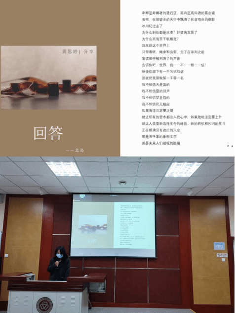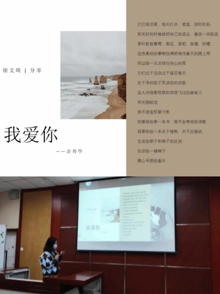 为更好地提升学生读书分享活动质量,加强不同学科之间学生思想的相互融合和碰撞,育慧书院不断探索读书分享会的举办模式。本学期试行了按照不同专业将学生分成小组,并由学生按照共同的兴趣拟定读书分享会的主题的方式开展活动。10月10日2020级学生选取了余秀华的《我爱你》、北岛的《回答》、王维的《新晴野望》、柳永的《望海潮》等现代及古代诗歌开展了诗歌赏读分享会,每位小组成员都充分表达了自己读诗的体会和感悟。