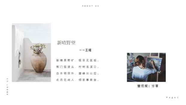 王维所著《新晴野望》中描写了大量的景物,就像绘画中描写的景物一样,不但拥有静态美,他还将山水诗赋予了动态美,这在其他诗集中是很少见的。王维的突出特点,是打破了这种界限,他不仅把诗中大自然的山水静态之美表现的酣畅淋漓,尽善尽美,而且使他的诗成为了一幅清净幽美的图画。这就为诗中的意境提供了广阔的想象空间。王维善于运用明净自然的语言,于凝练含蓄中直接传达自己的情感,引起读者的共鸣,产生“诗中有画”的艺术效果,欣赏诗的同时也如同欣赏一幅画卷。