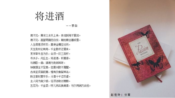 《将进酒》原是汉乐府短箫铙歌的曲调,题目意译即“劝酒歌”,在这首里李白“借题发挥”借酒浇愁,抒发自己的愤激情绪。这首诗非常形象的表现了李白桀骜不驯的性格:一方面对自己充满自信,孤高自傲;一方面在政治前途出现波折后,又流露出纵情享乐之情。全诗气势豪迈,感情奔放,语言流畅,具有很强的感染力。