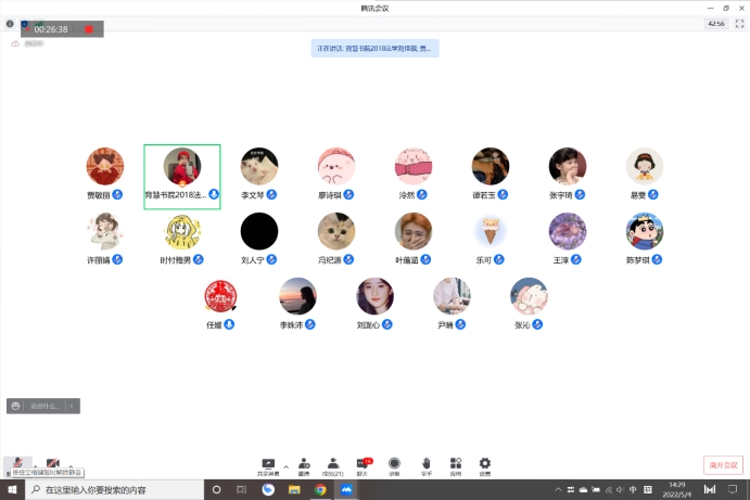 随后,法学院刘佳琪同学报告了2018育慧书院各位同学的毕业去向。全班24名同学中目前已有7名同学获得境内外研究生院校录取,另有1名同学推迟境外院校申请,1名同学等待国考面试通知,5名同学找到理想的工作就业,8名同学计划再次参加2022年后半年的全国研究生统一入学考试。一分耕耘一分收获,同学们在腾讯会议聊天界面中相互祝福与鼓励,纷纷表示感谢书院领导和老师的关怀与帮助,感谢书院提供的专业资源、研学机会、学习平台,使大家的专业能力和综合素质得到不断提升。