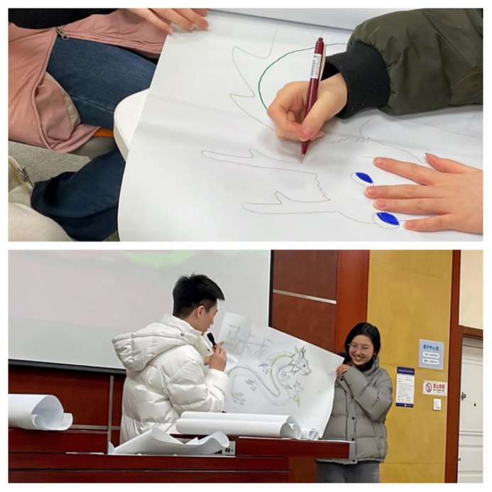 “龙跃九霄,鹏程万里”,别开生面的“画龙点睛”接力绘画在一片欢声笑语中展开,一幅幅栩栩如生的龙画展现了学生们天马行空的创意和团队合作精神,彰显了书院学子们在新的一年里不断突破自我、创造辉煌的决心。