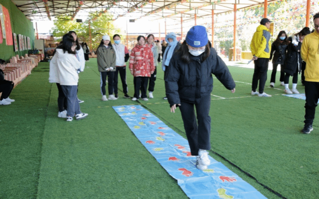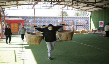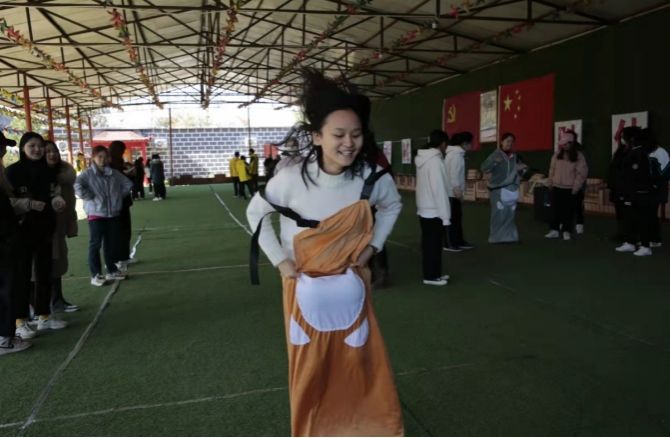 “袋鼠运瓜”中,学生欢快的大步迈进,充满着活力与自信。