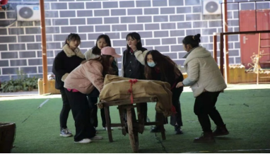 在“仓鼠跑步”环节中,众人将数张报纸粘连在一起,成为一个可以滚动的轮轴,缓慢前进着。